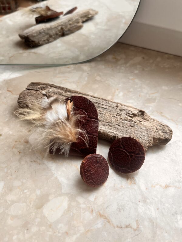 Odkryj wyjątkowy komplet biżuterii, w którym broszka jest prawdziwym bohaterem. Wykonana ręcznie ze skóry z odzysku, w odcieniach brązu o wyraźnej fakturze, zdobiona delikatnymi piórkami, tworzy kompozycję, której nie powtórzy nikt inny. To jedyny egzemplarz w mojej kolekcji.