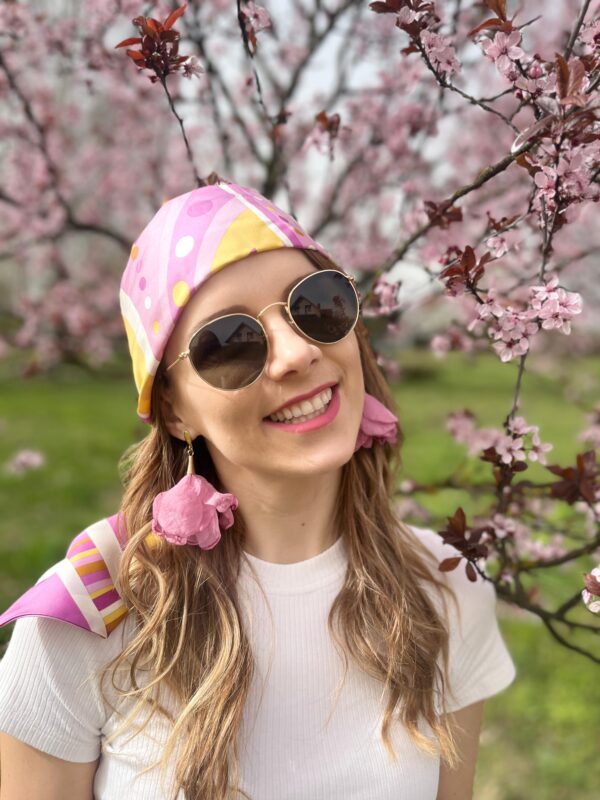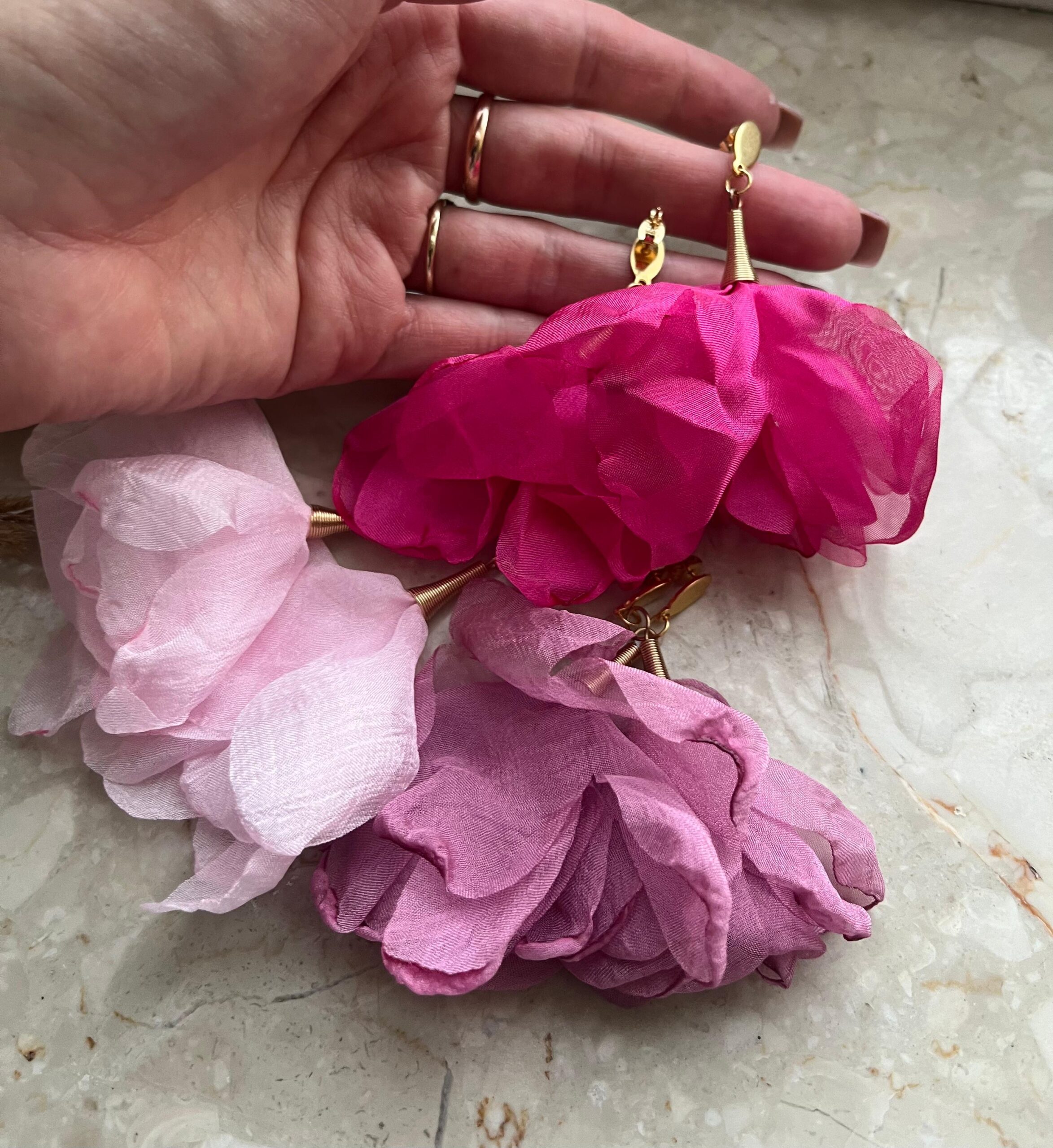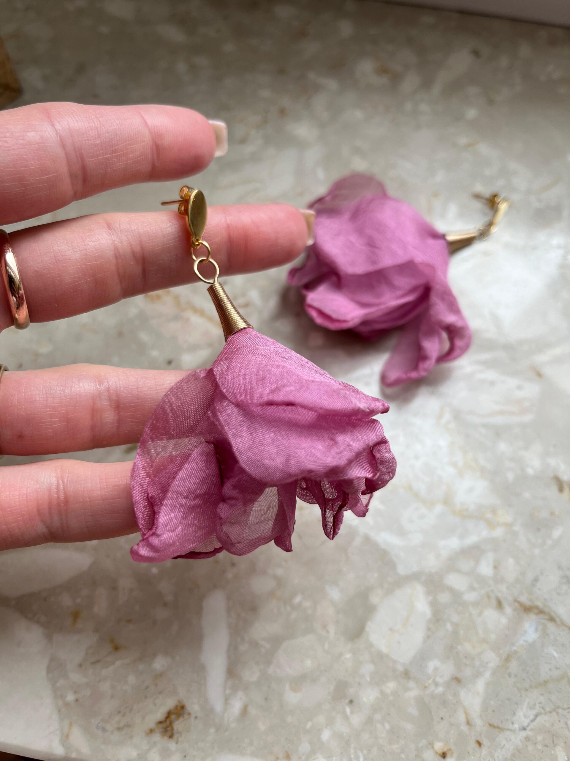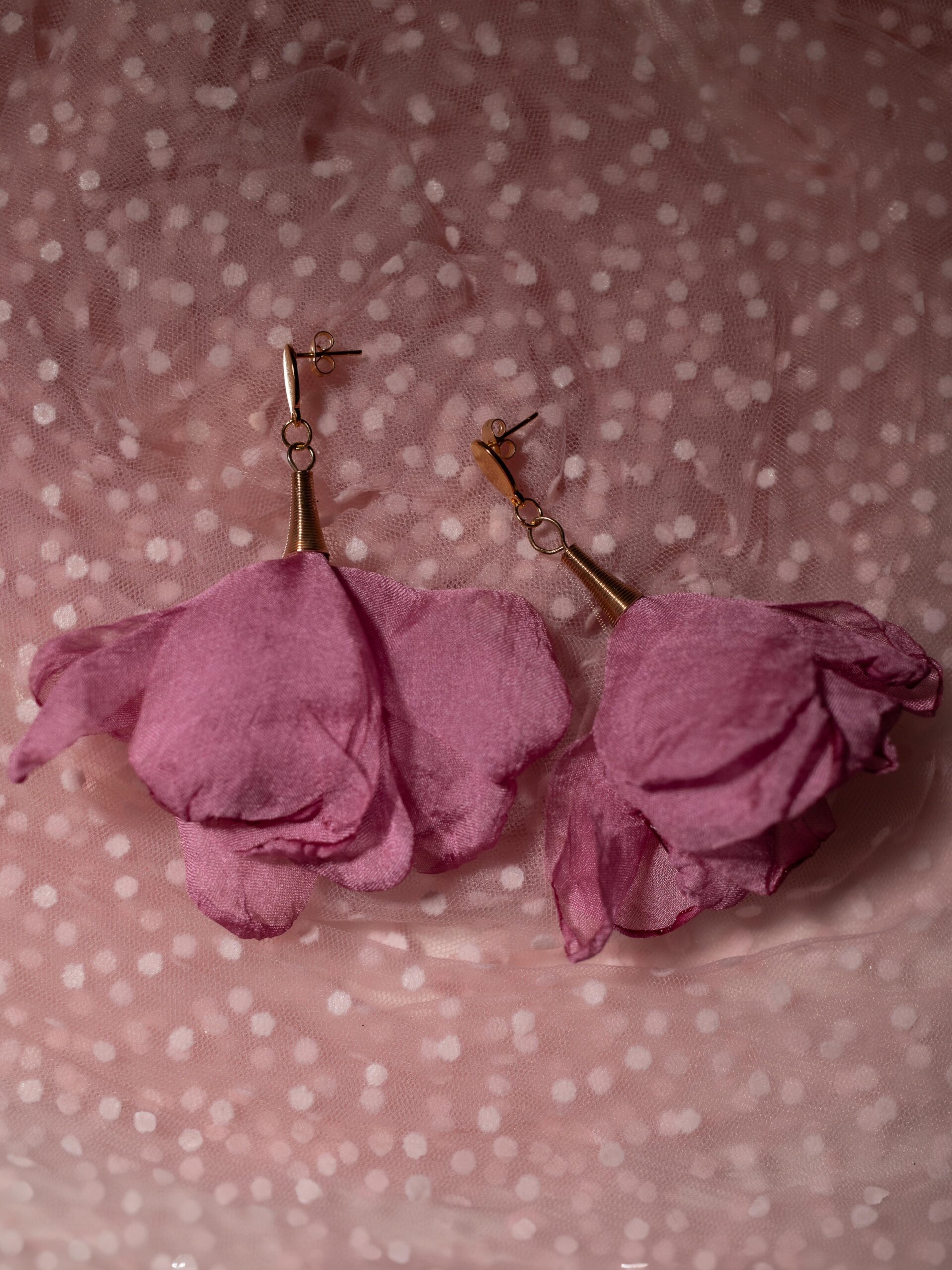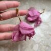 Odkryj unikatowe kolczyki, które zachwycają subtelnym urokiem szyfonowych kwiatów w kolorze zgaszonego różu.