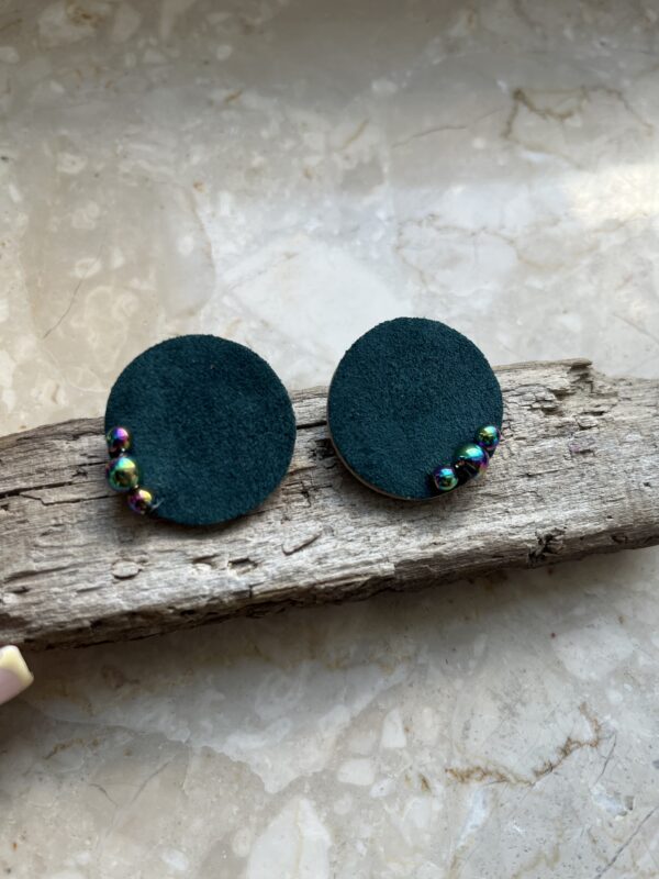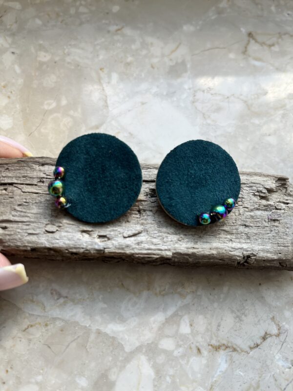 Odkryj połączenie miękkiego zamszu w odcieniach morskiej toni z delikatnym połyskiem koralików hematytu.