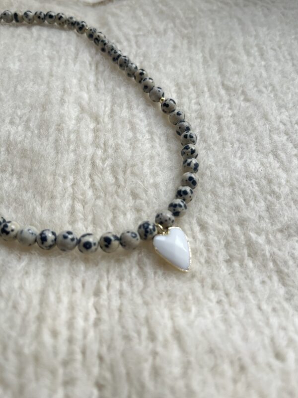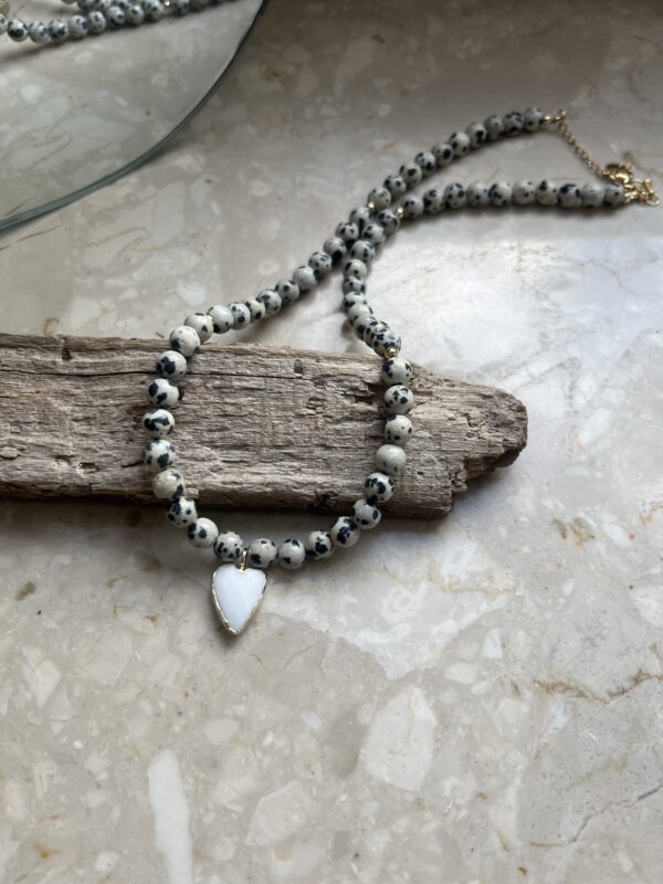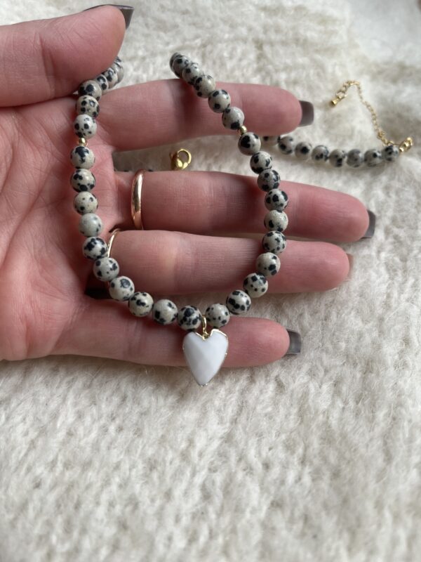 Całość uzupełnia delikatna zawieszka w kształcie serca – z Jadeitu w metalowej oprawie – która dodaje biżuterii subtelnej elegancji.