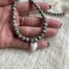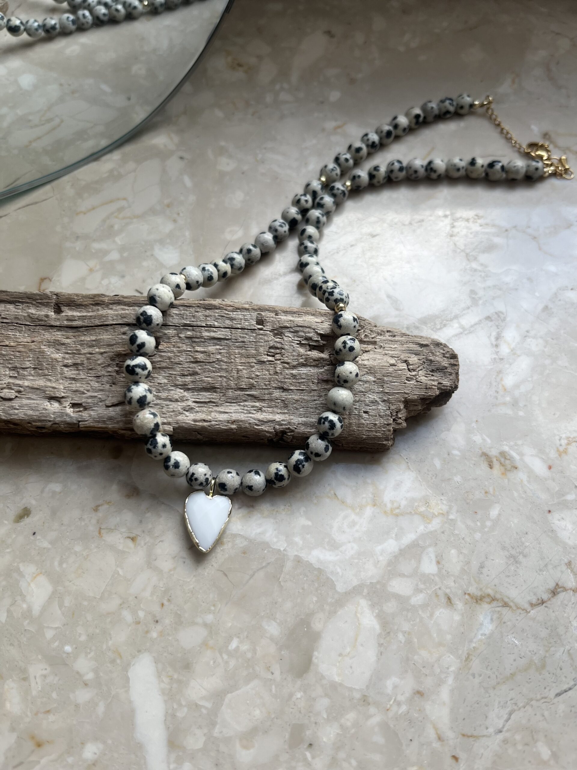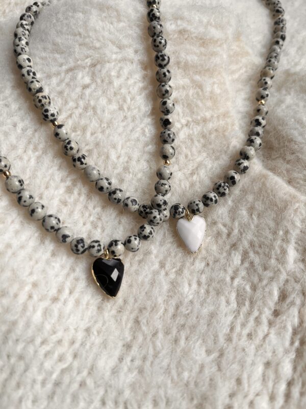 Wyjątkowy, przyciągający wzrok naszyjnik wykonany z naturalnych kamieni Jaspisu w czarno-białe kropki. Każdy kamień ma unikalny wzór, dzięki czemu naszyjnik jest niepowtarzalny.