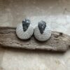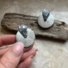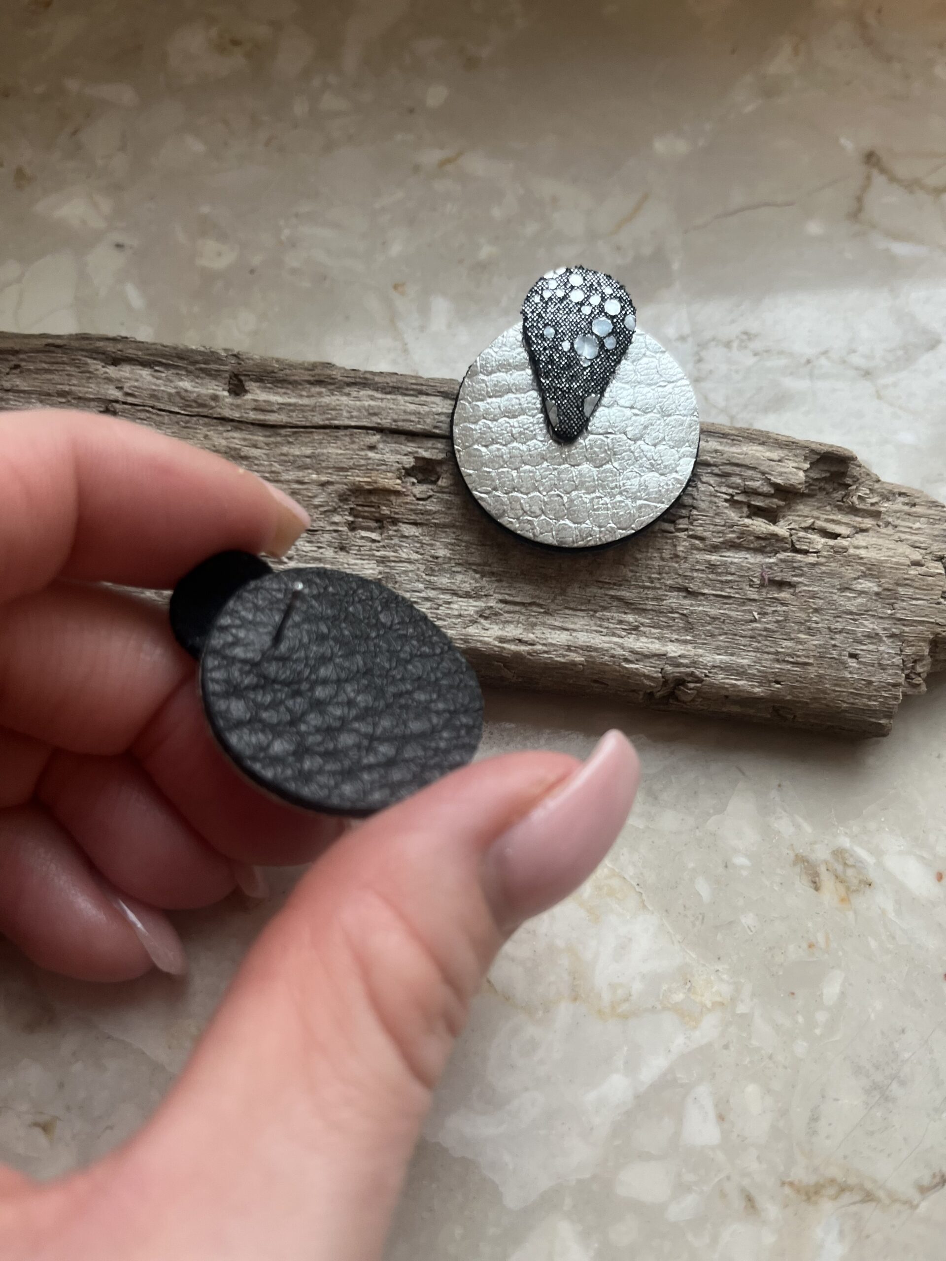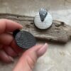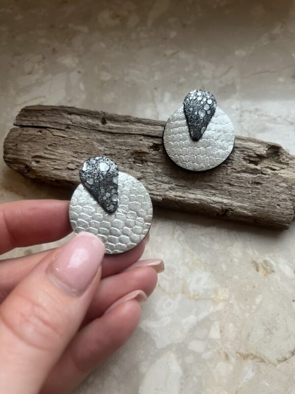 Kolczyki w formie kół, w kolorystyce srebra i głębokiej czerni z drobinkami, które subtelnie odbijają światło przy każdym ruchu.
