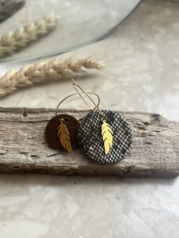 z zawieszką z odzyskanej zamszowej skóry oraz subtelnym piórkiem ze stali chirurgicznej.